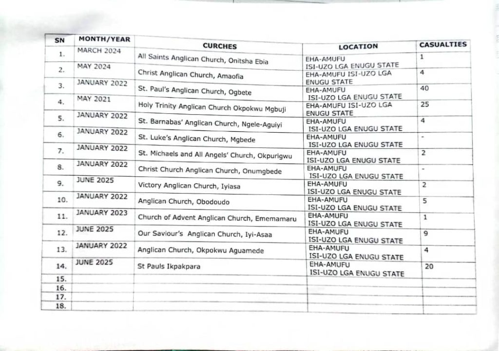 Intersociety’s data detailed 14 separate church attacks in Eha-Amufu alone, with both Anglican and Catholic parishes among the victims.